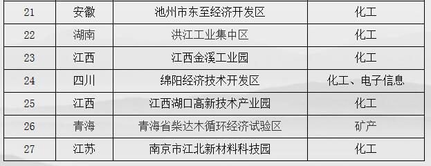 入圍的化工園區(qū)有:上海化學(xué)工業(yè)區(qū)、四川什邡經(jīng)濟(jì)開發(fā)區(qū)、安慶市高新技術(shù)產(chǎn)業(yè)開發(fā)區(qū)、姚家港化工園、宜都高新技術(shù)產(chǎn)業(yè)園、祥云財(cái)富工業(yè)園、連云港徐圩新區(qū)、江西德安工業(yè)園、泰興經(jīng)濟(jì)開發(fā)區(qū)、荊門化工循環(huán)產(chǎn)業(yè)園、江西新干工業(yè)園、貴州福泉經(jīng)濟(jì)開發(fā)區(qū)、池州市東至經(jīng)濟(jì)開發(fā)區(qū)、洪江工業(yè)集中區(qū)、江西金溪工業(yè)園、綿陽(yáng)經(jīng)濟(jì)技術(shù)開發(fā)區(qū)、江西湖口高新技術(shù)產(chǎn)業(yè)園、南京市江北新材料科技園。