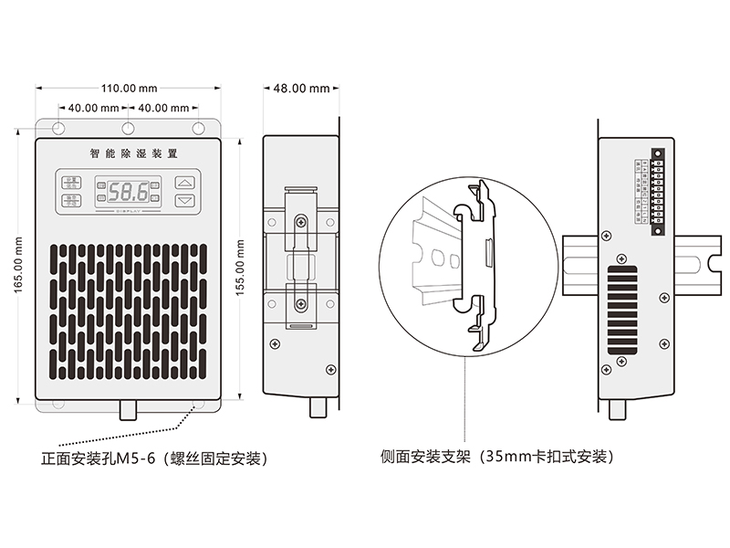 1、使用M5螺釘或者5mm的鉚釘固定。安裝時除濕裝置必須豎放,出水口朝下。
